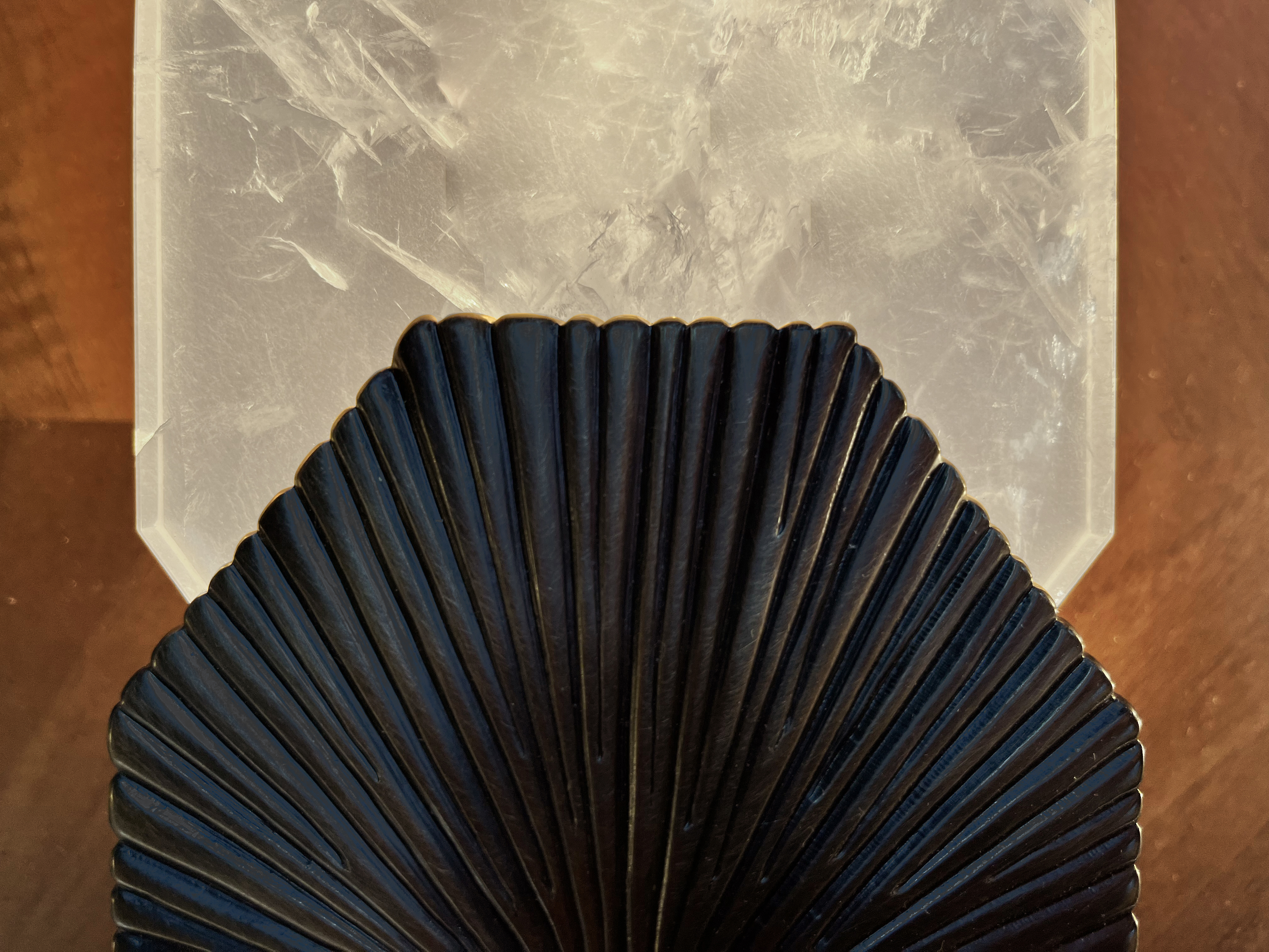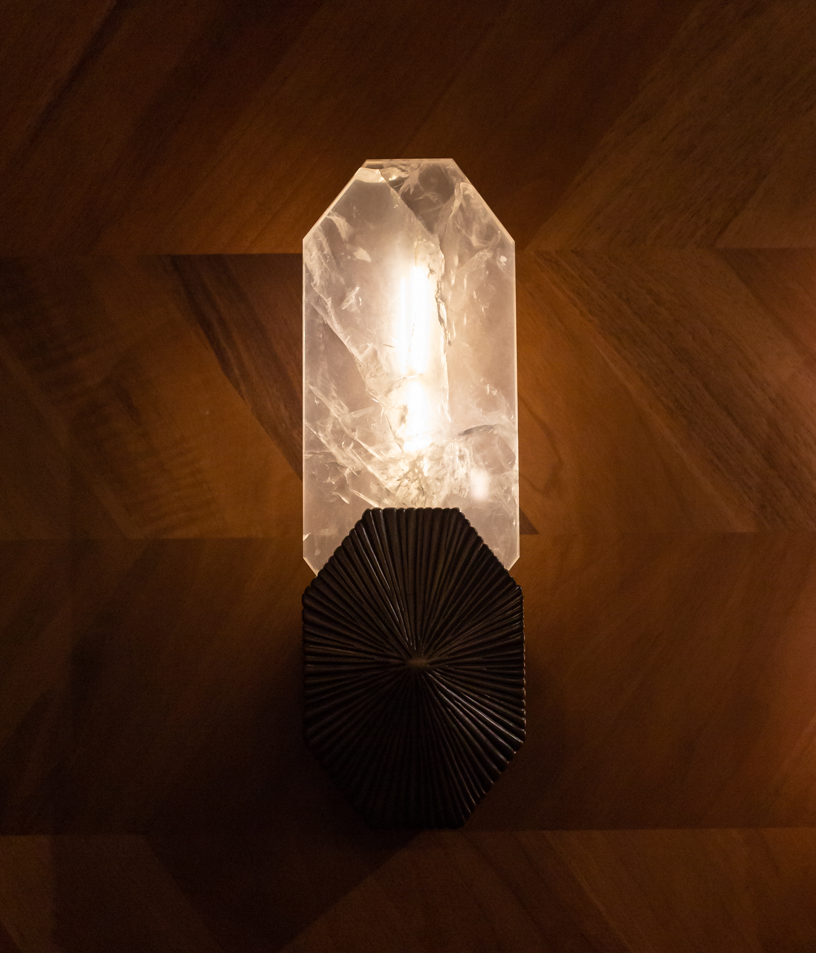 The Verdon Fixtures are a new addition to TCS Studio. This family is made up of a tri-faceted pendant & wall sconce. The diffuser on each fixture is made of custom cut, geometric quartz rock crystal, which is fastened to a cast brass frame. Each fixture body has a decorative starburst inspired brass shield, which houses an E26, T30 Lamp.
